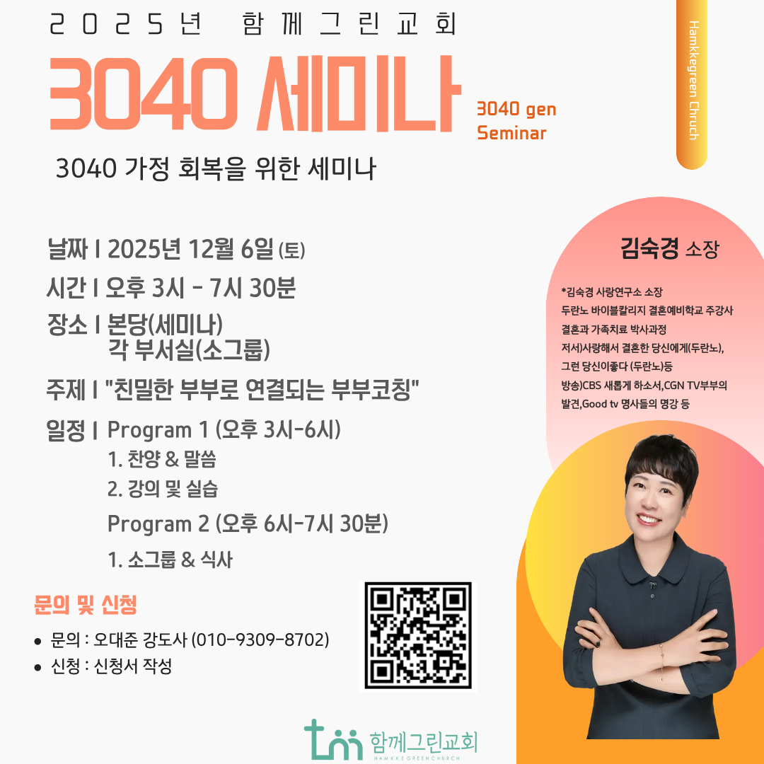 📌 아름다운 가정은 ‘결심’이 아니라 ‘성경적 배움’에서 시작됩니다. 이번 세미나는 말씀 안에서 서로를 더 깊이 이해하고, 하나님께서 기뻐하시는 가정으로 서는 은혜의 자리가 될 것입니다.